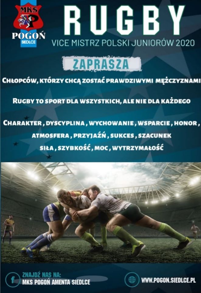 23 KWIETNIA 2026 Rugbowe emocje na najwyższym poziomie25 kwietnia upłynie pod znakiem Ogólnopolskiego turnieju dzieci i młodzieży w rugby, zaś najważniejszym punktem 26 kwietnia będzie mecz na szczycie Ekstraligi: Awenta MKS Pogoń Siedlce – Ogniwo Sopot. | więcej |