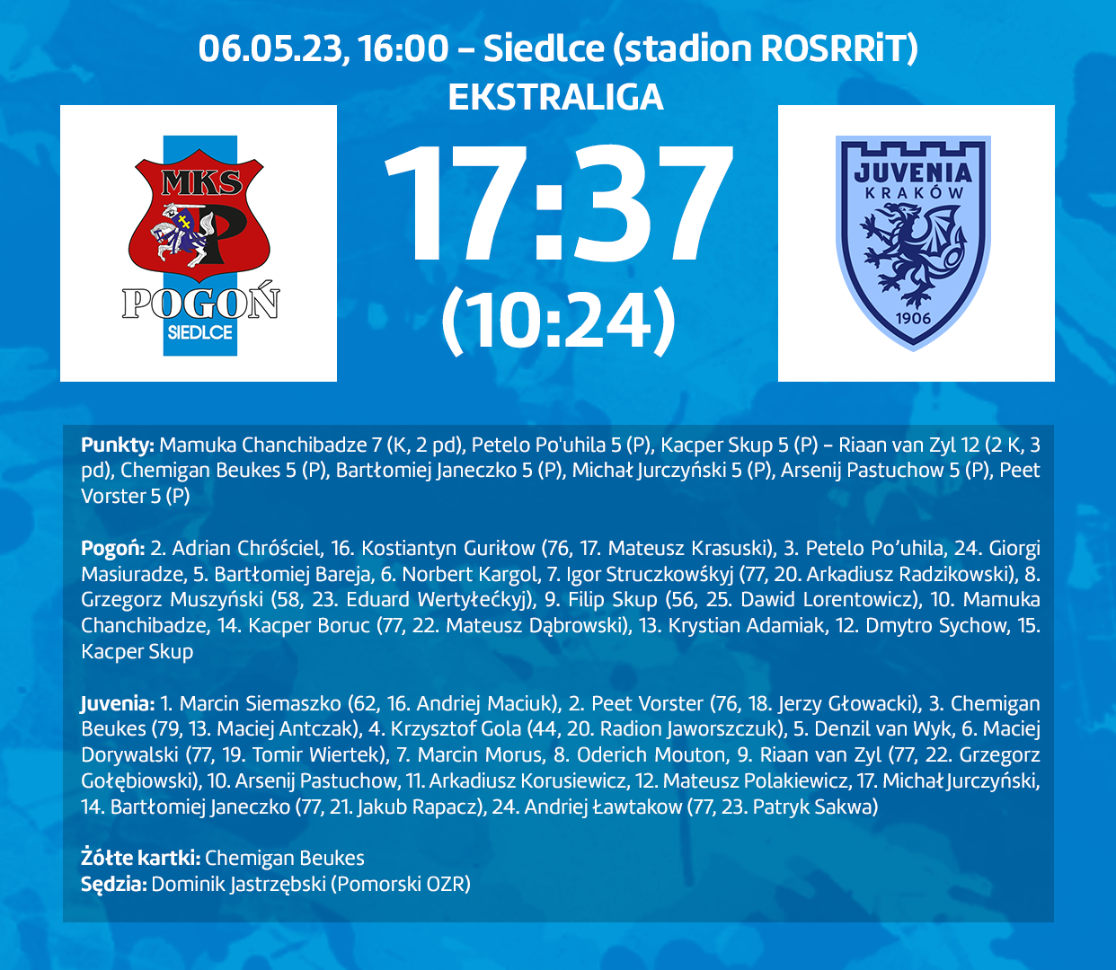 19 KWIETNIA 2026 Pełna pula w KrakowiePogoniści wygrali 52:22 z Juvenią Kraków. Za tydzień w Siedlcach hit z Ogniwem Sopot. | więcej |